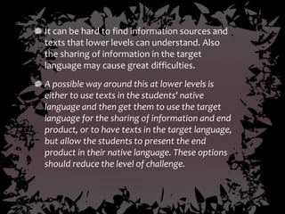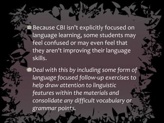 Content-based instruction uses subject matter from academic disciplines as the vehicle for language instruction rather than focusing on language skills alone. Historically, content in language teaching referred mainly to grammatical structures, but communicative approaches broadened the definition of content. Content-based instruction integrates learning a language with learning academic content, providing benefits such as increased motivation, but potential problems need to be addressed like ensuring language objectives are met.