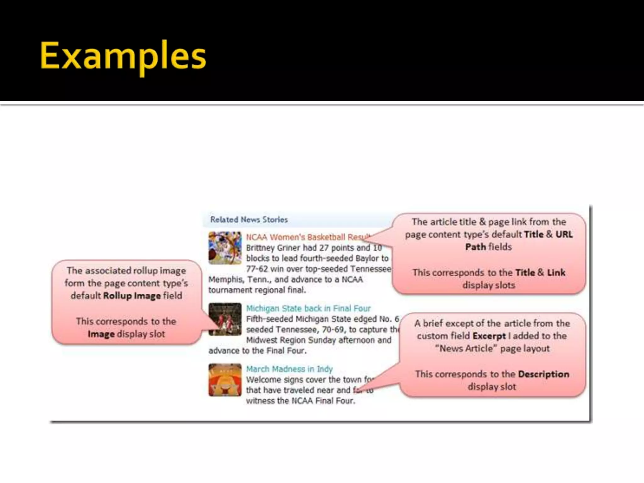 The Content Query Web Part allows aggregation of content from lists and libraries across a site collection and displays it in configurable ways on web pages. It has sections for configuring queries, presentation, sources, filters, grouping, sorting and styles. The Imtech Content Query Web Part adds paging capabilities that the standard web part lacks.