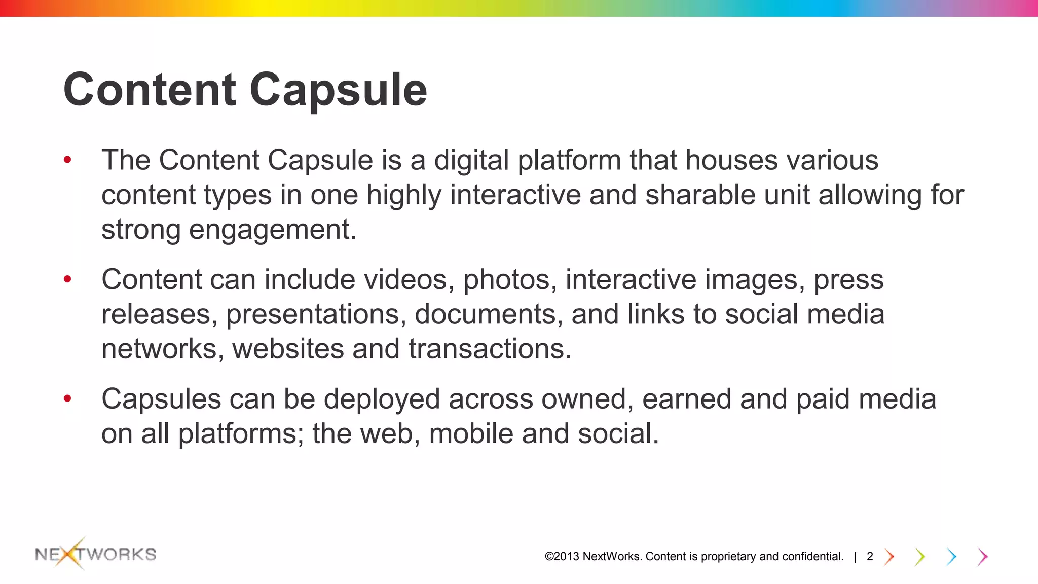 The document describes a Content Capsule, a digital platform that houses various content types such as videos, photos, documents and social media links in an interactive and shareable format. Content Capsules can be deployed across websites, mobile apps, and social media. They are designed to allow viewers to interact with content and make informed decisions through progressively more in-depth content without leaving the capsule. All content in a Capsule can be updated in real-time.