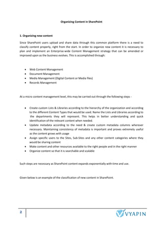 This document discusses content classification and organization in SharePoint. It describes organizing new and existing content through methods like creating custom lists and libraries, assigning metadata, and granting access to users. Content can become disorganized over time, so the document also discusses reorganizing content through classification by usage, content types, and collaboration. Facilitating search and retrieval, addressing content bloat, and ensuring users get the right content through further classification are also summarized. The importance of tools that can perform bulk classification and enable enterprise content management is highlighted.
