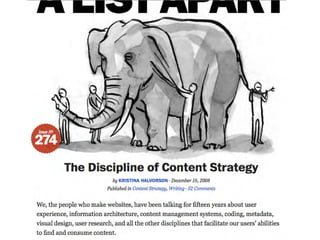 This document discusses various topics related to content strategy including principles, strategy, process, roles, and perceptions. It emphasizes that principles internally motivate good work, strategy keeps teams accountable, process should not be the primary focus, roles give teams structure, and perceptions should give way to broader perspectives. Anonymous client stories are presented throughout as examples. The overall message is that content strategy requires considering many interrelated human factors.