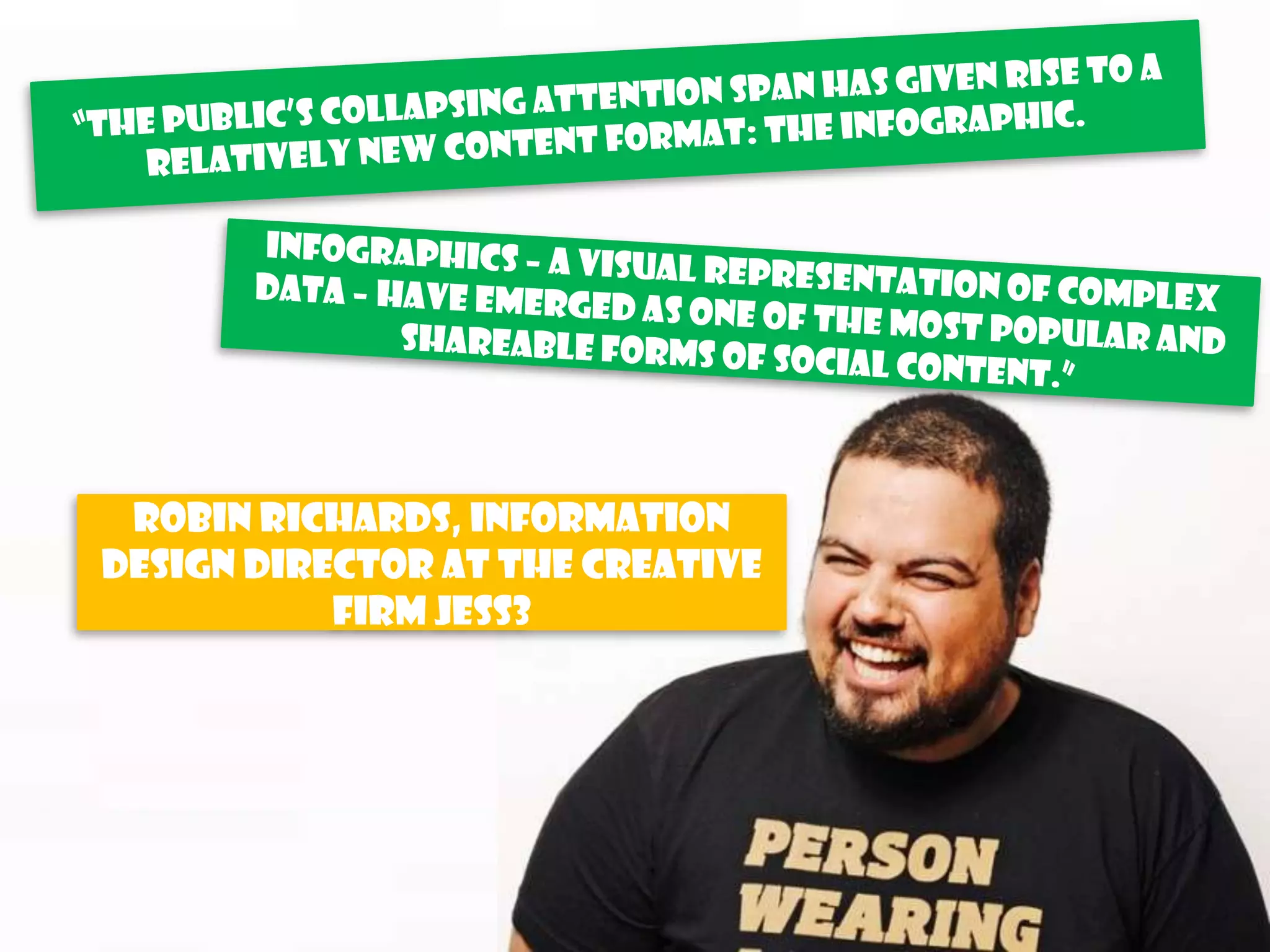 Robin Richards emphasizes the benefits of infographics in communication, noting they are time-efficient, easily understood, and cater to visual learners. He highlights two main B2B marketing applications: editorial content for thought leadership and brand-centric content for traffic generation. The document also addresses the characteristics of effective infographics, such as storytelling and measurable ROI.