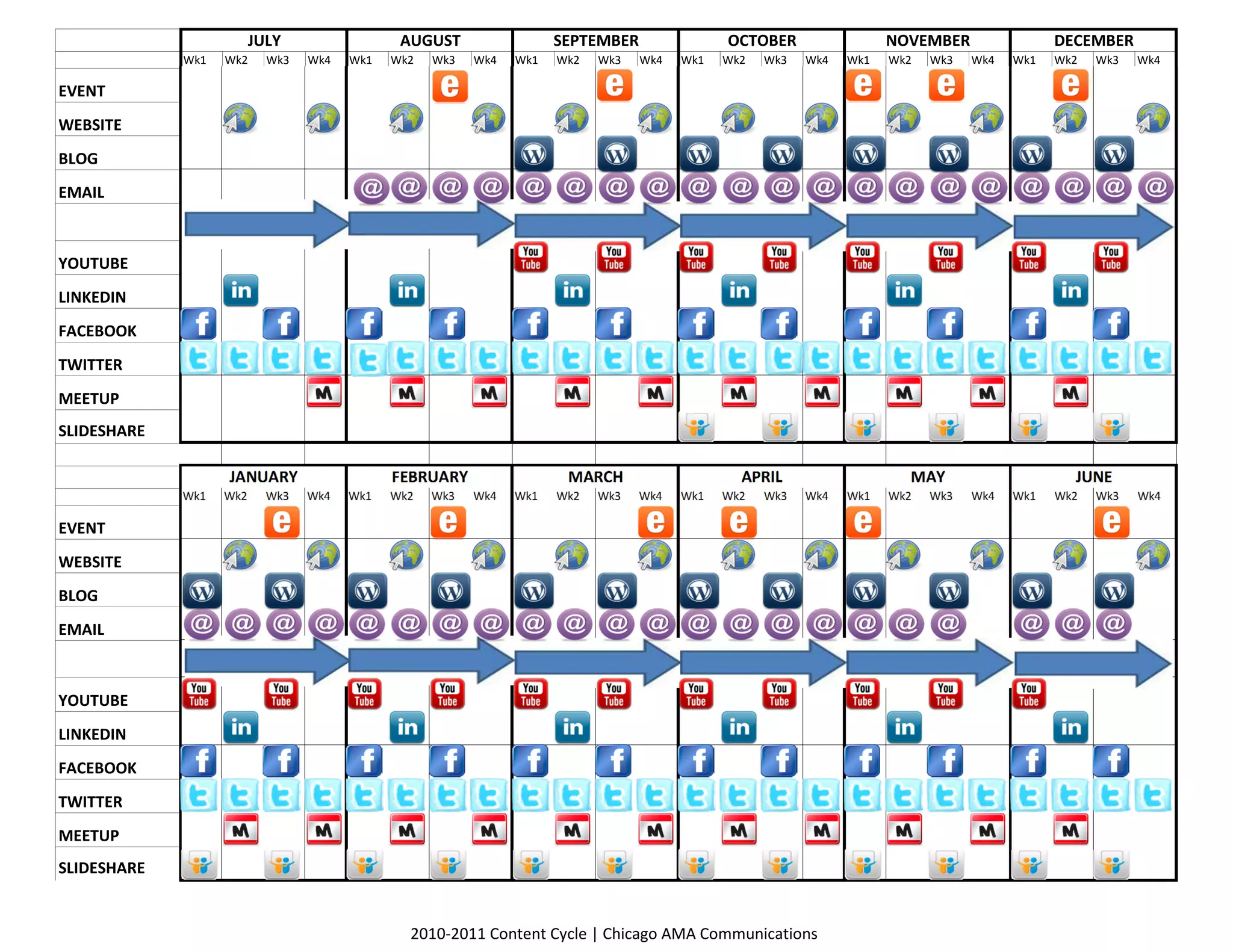 The document displays a content calendar for an organization spanning 2010-2011. It charts out various marketing and communication activities on a weekly basis across 12 months, including events, website, blog and email updates as well as social media posting on YouTube, LinkedIn, Facebook, Twitter, Meetup and SlideShare. The calendar aims to plan out engagement, content creation and distribution across multiple channels over the year.
