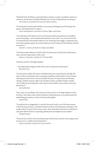 The document provides positive reviews and praise for Cory Doctorow's book "Little Brother" from various publications and authors. The reviews highlight that the book tells a believable and frightening tale of a near-future San Francisco, contains sharp dialogue and detailed descriptions, and features a wonderfully developed main character. They praise the book for raising pertinent questions and fostering discussion on technology and civil liberties. The reviews also commend Doctorow for his fluid writing style and ability to find the human element in technology.