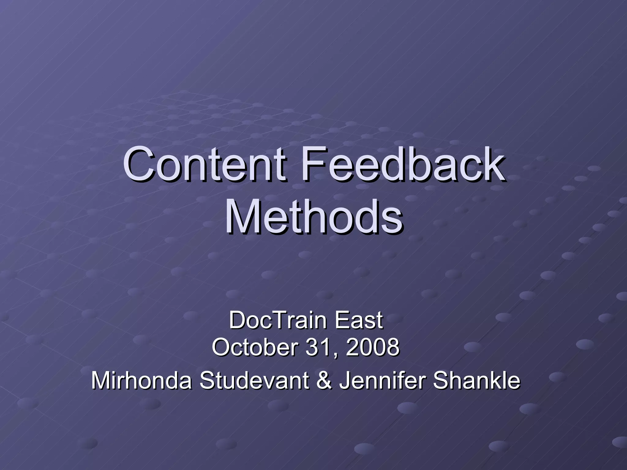 The document discusses the importance of customer feedback in documentation and its impact on customer satisfaction and loyalty. It outlines various methods for obtaining feedback, including surveys, usability studies, and user forums, along with their challenges and effectiveness. Additionally, it emphasizes the need to analyze feedback processes and continuously improve documentation based on audience needs and feedback results.