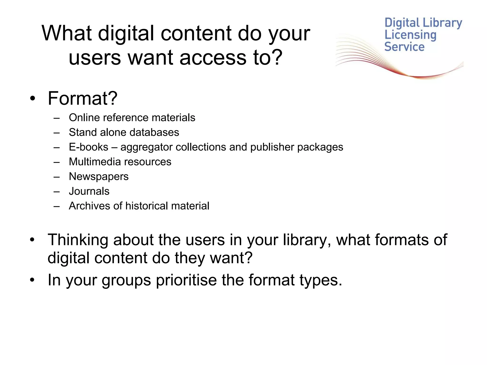 1) What digital content formats and subject areas do users want access to? Formats include e-books, databases, journals, and multimedia. Popular subject areas include biography, business, health, history, science and more.