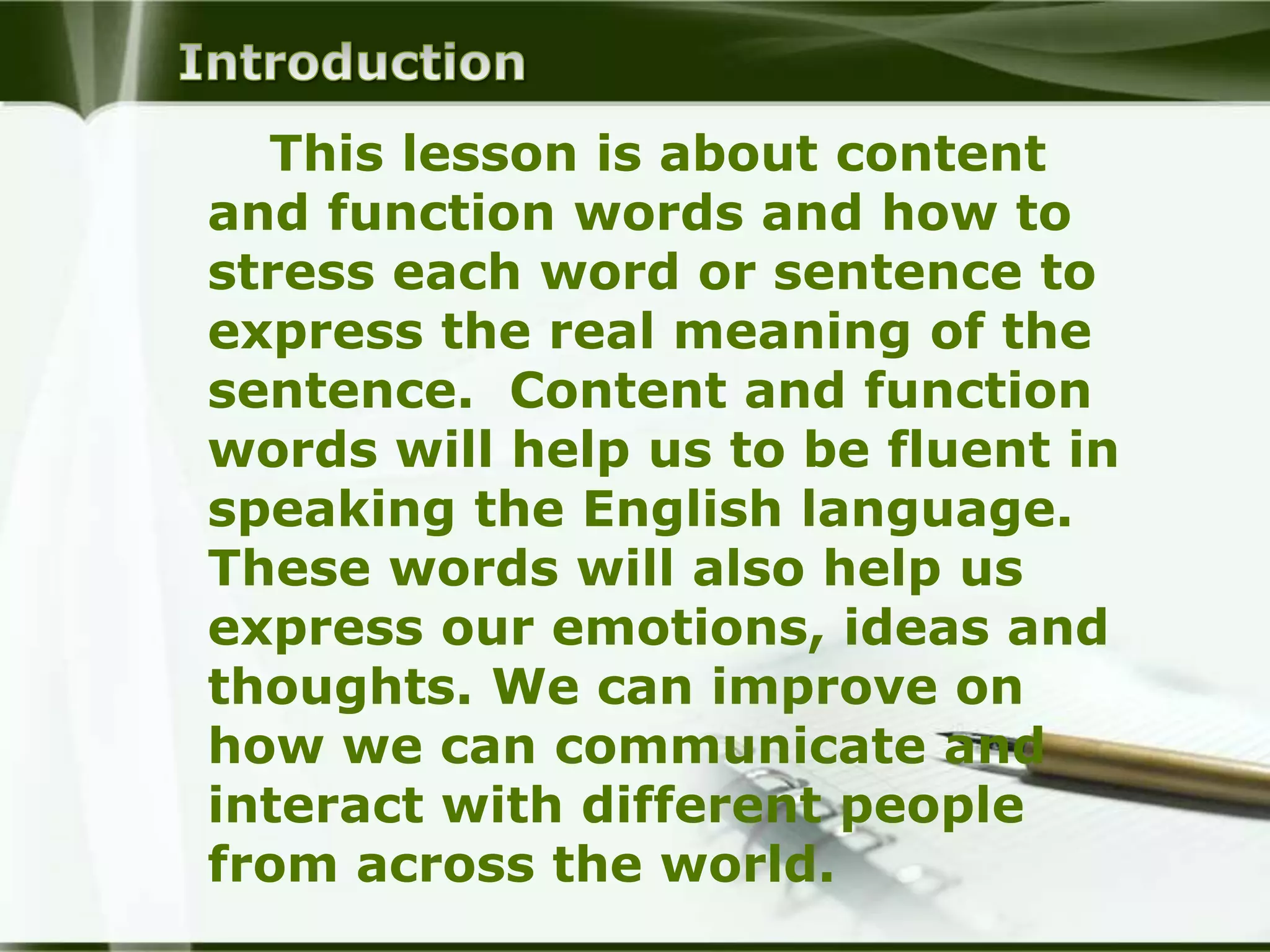 This document discusses content words and function words, and how stressing each word can help express meaning and communicate effectively. Content words include nouns, verbs, adjectives and sometimes adverbs, while function words help make sentences grammatical and include pronouns, prepositions, conjunctions and auxiliary verbs. The document provides examples and rules for stressing words and sentences to convey intended meaning.