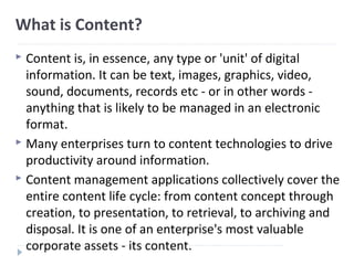 Content management involves managing all types of digital information throughout its lifecycle, including text, images, video, and more. It encompasses content creation, organization, storage, search, retrieval, preservation, and other functions. Effective content management helps organizations reuse content, integrate information sources, improve communications, and gain productivity benefits. However, most business information exists as unstructured data, which poses management challenges. Trends include growing volumes of web content, use of content management in more channels, and demand for better handling of unstructured information.