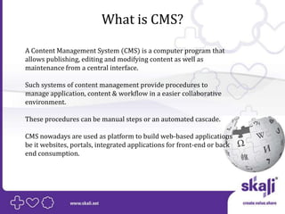 This document discusses key considerations for choosing an enterprise content management system (CMS). It outlines some benefits of CMS including allowing centralized publishing, editing and modifying of content. It describes features important for enterprise CMS such as simplifying development, unifying presentation strategies, and unifying content, portals and applications. The document promotes choosing an all-in-one CMS for these benefits and also emphasizes the value of collaboration and support. It provides an example of what a collaborative CMS environment might look like.