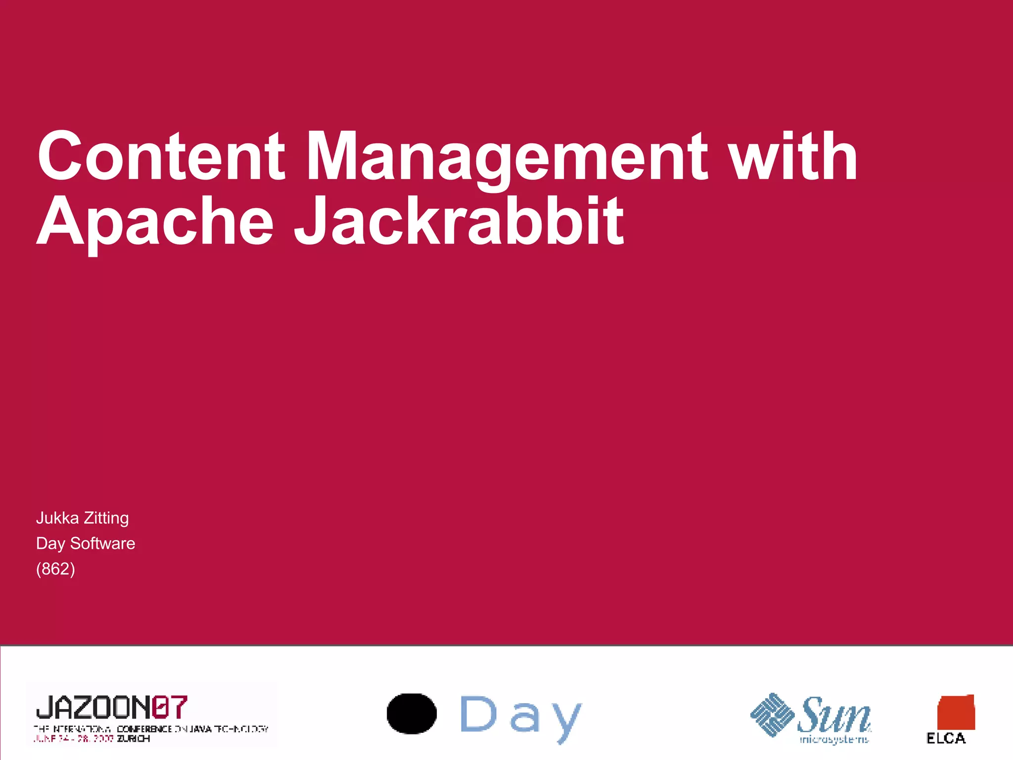 The document provides an overview of Apache Jackrabbit, a content repository system that implements the JSR 170 specification. It discusses Jackrabbit's basic content modeling approach using node types and hierarchies, alternative views through references and search capabilities, advanced features like versioning and personalization, and best practices for implementation. The presentation concludes with encouragement to consider content management for any application that stores digital assets and information.