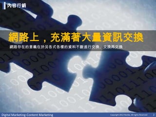 Digital Marketing-Content Marketing Copyright 2012 Norika. All rights Reserved 2