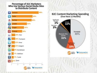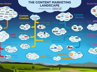 This document provides an overview of content marketing. It defines content marketing as creating and delivering valuable content to a target audience. It lists different types of content that can be used, such as whitepapers, ebooks, case studies, audio/video, blog posts, events, images and infographics, and email newsletters. The document discusses how content marketing generates more leads than traditional marketing, builds trust, creates value for customers, and decreases costs while increasing customers. It positions content marketing as the cornerstone of marketing strategies and discusses how content directly affects search engine optimization and helps push leads down the sales funnel, while not directly selling. It provides tips on planning a content marketing strategy by identifying the audience, their pain points and where
