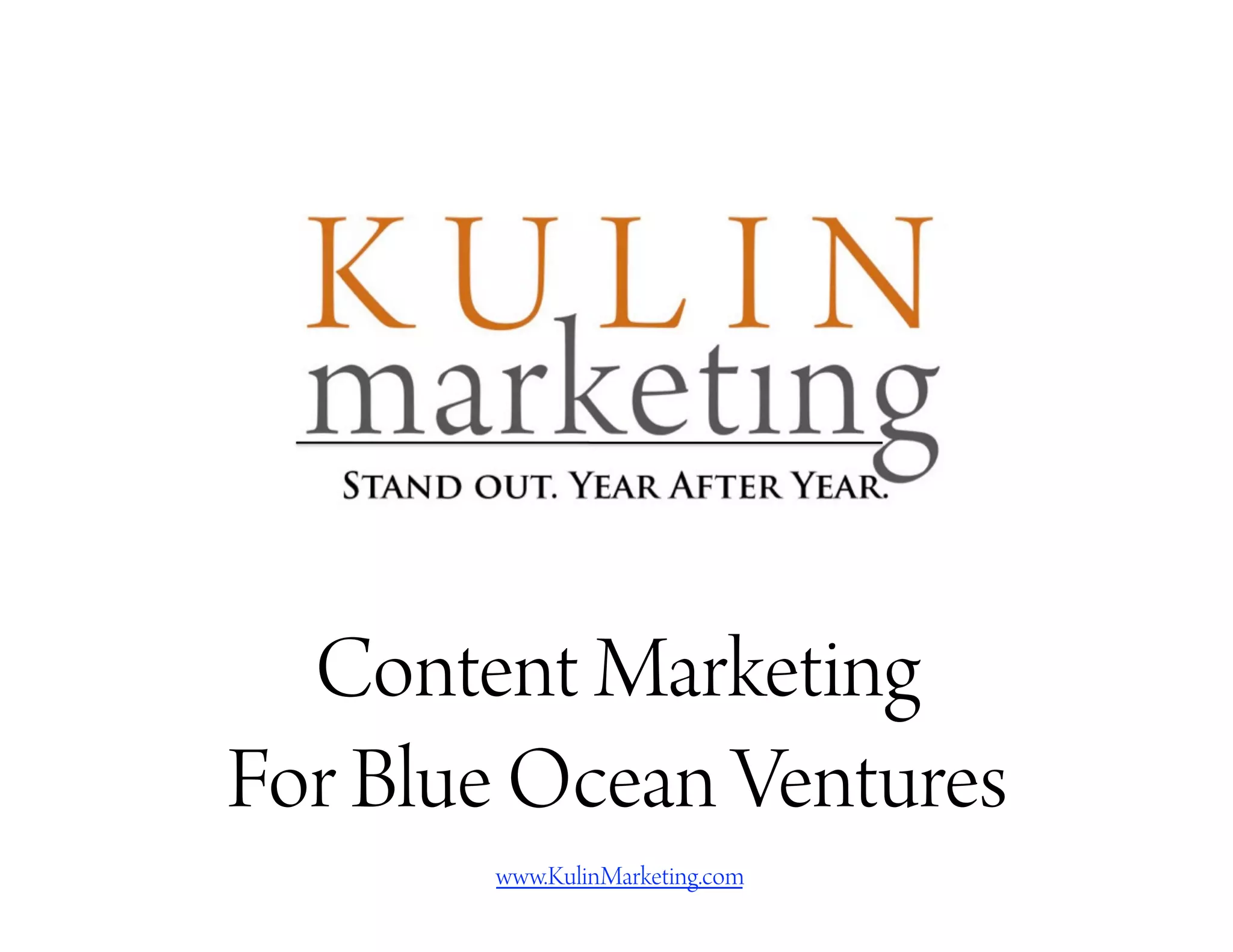 This document provides an overview of content marketing and how to effectively implement a content marketing strategy. It recommends creating a keyword list focused on long-tail keywords and using Google's keyword tool to identify keywords with low competition and high monthly searches. It then suggests creating different content vehicles like blogs, social media accounts, and videos and publishing content twice daily that incorporates those keywords while engaging audiences. The goal is to establish thought leadership and rank highly in search engines through regularly published visual and text-based content.