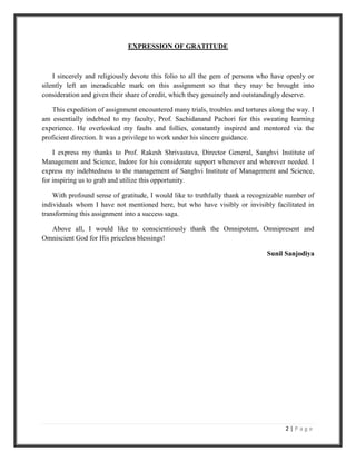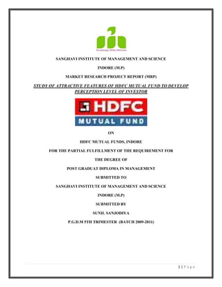 This document summarizes a market research project report submitted by Sunil Sanjodiya to the Sanghvi Institute of Management and Science in partial fulfillment of requirements for a postgraduate diploma in management. The report studies the attractive features of HDFC Mutual Fund to develop investor perception levels in Indore, India. It includes an acknowledgement, declaration, certificate from faculty guide, preface, and chapters on the history and phases of development of the Indian mutual fund industry as well as the company profile of HDFC Mutual Fund.