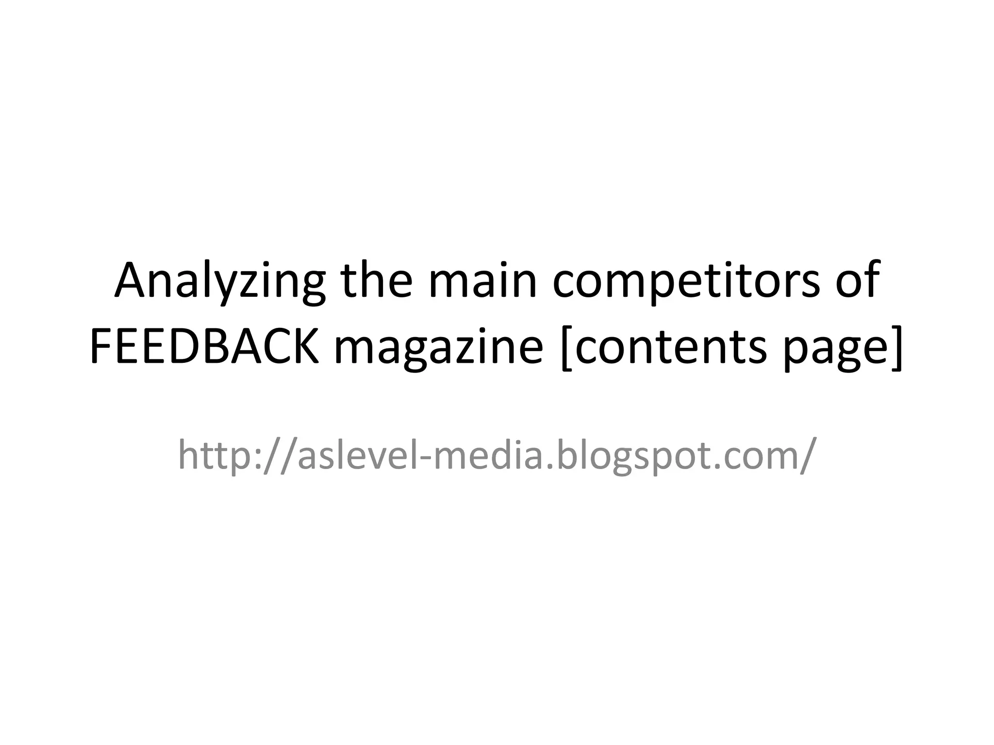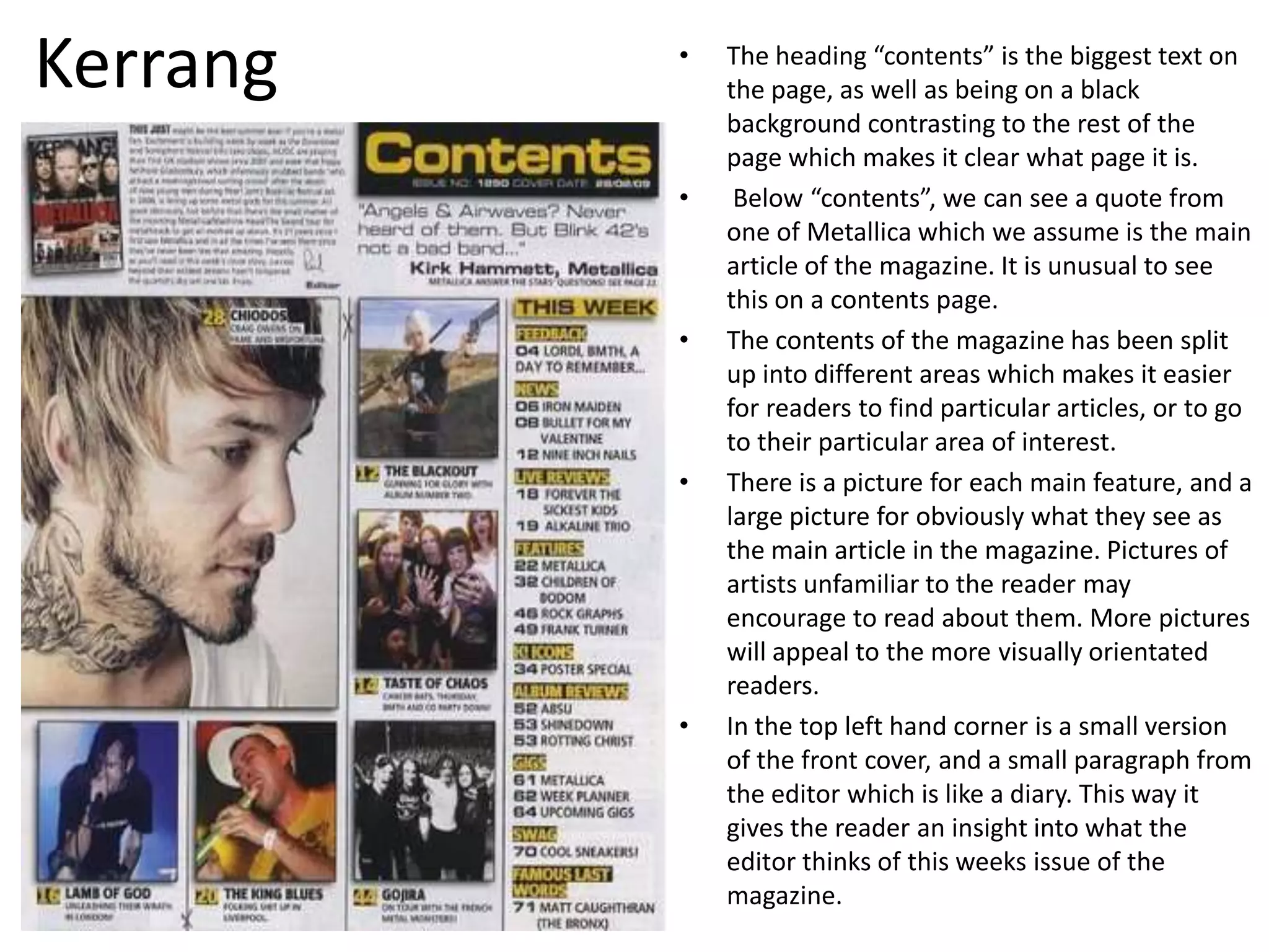The document analyzes the contents pages of three music magazines: Kerrang, MOJO, and Q. It finds that Kerrang uses a large heading and artist quotes to organize its contents. MOJO divides content into areas defined by color and uses a single featured image. Q similarly uses color-coded sections but only has two main headings to keep it simple, and calls out an Oasis special feature section.