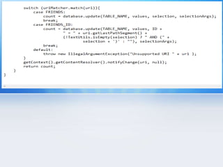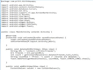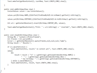 This document provides an overview of content providers in Android. It discusses how content providers allow apps to share data by presenting it as one or more tables. The content resolver accesses the content provider using query(), insert(), update(), and delete() methods. A content URI uniquely identifies data in a provider. Cursors provide random read-write access to query results from a content provider. The document also provides an example Birthday Saver app project that demonstrates using a content provider to store and retrieve birthday data from a database in another app.
