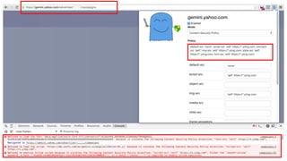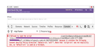 The document discusses the importance of implementing Content Security Policy (CSP) as a defense against cross-site scripting (XSS) and other web attacks by allowing the specification of trusted resource locations. It outlines CSP directives, best practices for deployment, and highlights the need to balance security with usability, mentioning potential challenges from browser extensions. Additionally, it offers tools and methods for testing and validating CSP compliance to enhance web application security.