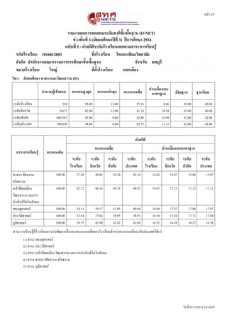 รายงานผลการทดสอบระดชบชาตตขชนพพชนฐาน (O-NET) ชชวงชชชนททท 3 (มชธยมศศกษาปปทท 3) ปปการศศกษา 2554 ฉบชบททท 5 - คชาสถตตตระดชบโรงเรทยนแยกตามสาระการเรทยนรรร รหชสโรงเรทยน 1016012003 ชพทอโรงเรทยน โคกกะเททยมวตทยาลชย สชงกชด สสานชกงานคณะกรรมการการศศกษาขชชนพพชนฐาน จชงหวชด ลพบบรท ขนาดโรงเรทยน ใหญช ทททตชงโรงเรทยน นอกเมพอง วตชา : วตทยาศาสตรร (95) จสานวนผรรเขราสอบ คะแนนสรงสบด คะแนนตทสาสบด สชวนเบททยงเบน คะแนนเฉลททย มาตรฐาน มชธยฐาน ฐานนตยม ระดดบโรงเรรยน 228 70.00 8.00 26.25 8.37 26.00 22.00 ระดดบจดงหวดด 9,675 98.00 4.00 31.05 11.63 28.00 26.00 ระดดบสดงกดด 605,430 100.00 0.00 32.28 11.51 30.00 28.00 ระดดบประเทศ 788,851 100.00 0.00 32.19 11.63 30.00 28.00 คชาสถตตต คะแนนเฉลททย สชวนเบททยงเบนมาตรฐาน สาระการเรทยนรรร คะแนนเตตม ระดชบ ระดชบ ระดชบ ระดชบ ระดชบ ระดชบ ระดชบ ระดชบ โรงเรทยน จชงหวชด สชงกชด ประเทศ โรงเรทยน จชงหวชด สชงกชด ประเทศ สรทงมรชรวรตกดบกระบวน 100.00 33.04 35.60 37.17 36.99 18.73 20.97 20.89 20.97 การดตารงชรวรต ชรวรตกดบสรทงแวดลนอม 100.00 44.30 53.94 55.66 55.76 21.05 23.42 23.27 23.42 สารและสมบดตรของ 100.00 22.12 25.14 25.68 25.63 13.12 15.76 15.72 15.76 สาร แรงและการเคลนทอนทรท 100.00 31.23 39.73 42.10 41.77 20.95 27.64 27.51 27.64 พลดงงาน 100.00 21.27 25.74 26.39 26.38 12.73 15.34 15.24 15.34 กระบวนการเปลรทยน 100.00 15.08 18.05 19.54 19.59 13.12 16.10 15.99 16.10 แปลงของโลก ดาราศาสตรรและ 100.00 28.86 34.75 35.28 34.99 21.37 22.30 22.28 22.30 อวกาศ ธรรมชาตรของวรทยา 100.00 30.04 34.29 37.33 37.01 34.20 34.79 34.81 34.79 ศาสตรรและเทคโนโลยร วดนทรท 07/12/2012 10:30:07
