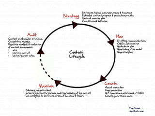 This document provides a summary of content strategy concepts and best practices. It discusses how content strategy guides plans for creating, delivering, and governing content to achieve business goals. It also covers defining the substance and structure of content, establishing workflows and ownership, and using tools like content audits, style guides, and governance policies. The document recommends resources like books, websites, and people in the field to learn more about developing an effective content strategy.