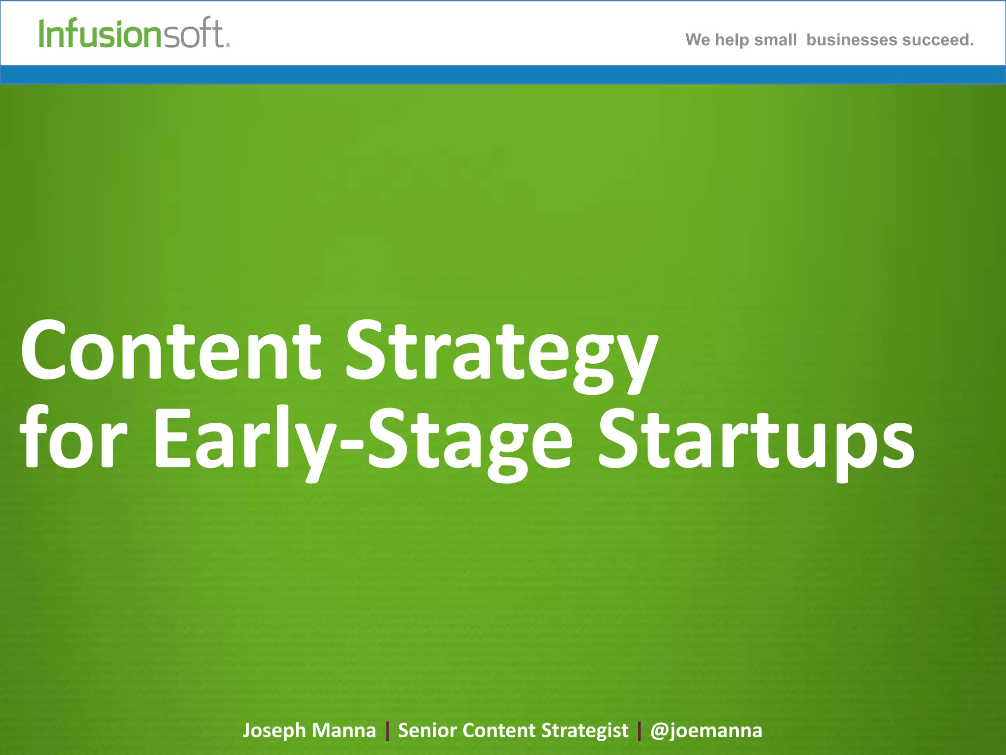 The document emphasizes the importance of content strategy for early-stage startups to resolve critical marketing issues such as weak messaging and low brand awareness. It outlines essential elements like storytelling and content formats, coupled with practical tips for effective content creation and promotion. Examples of successful businesses highlight the effectiveness of strategic content in attracting target customers and driving business value.