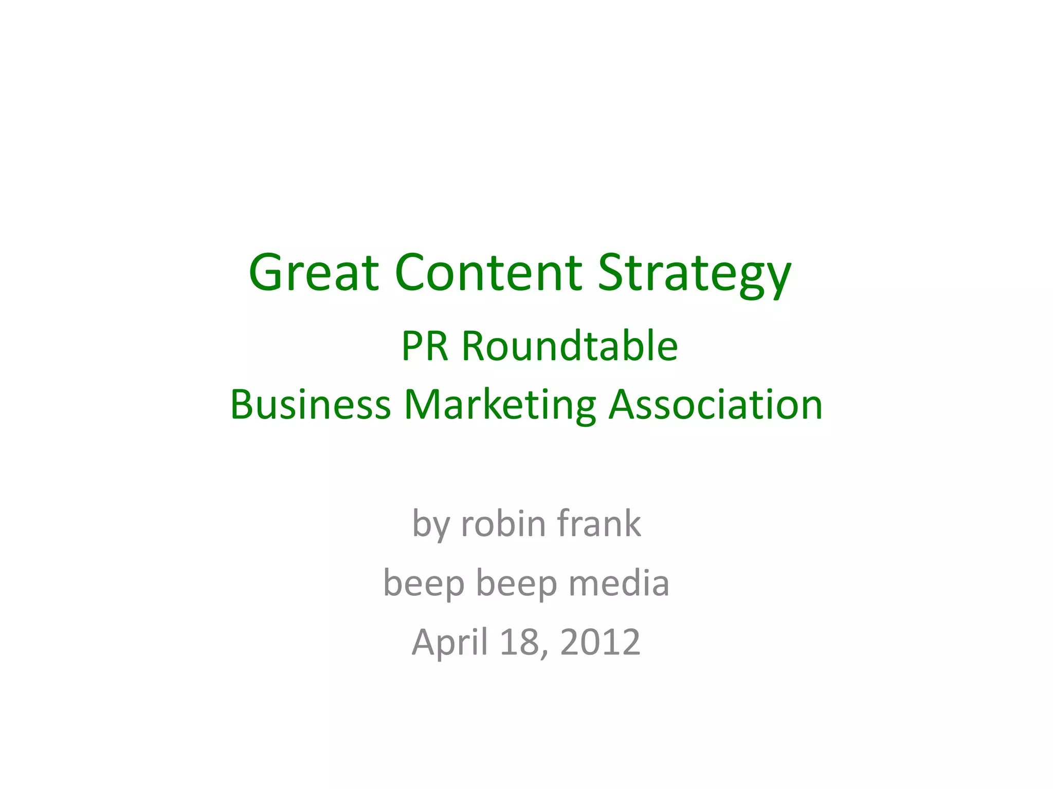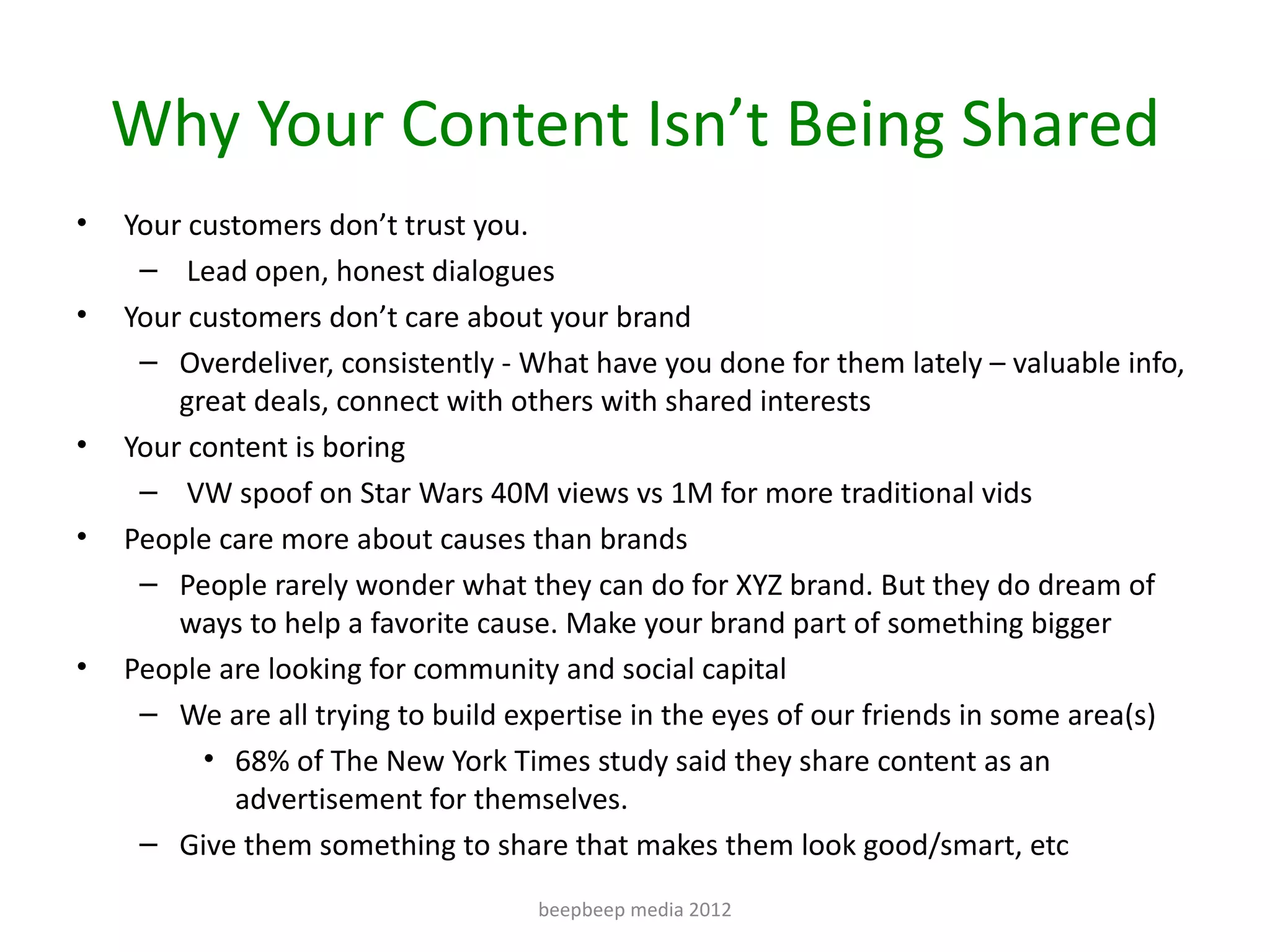 The document outlines effective strategies for improving content sharing and engagement in social media marketing, highlighting the importance of understanding audience needs and preferences. Key points include optimizing content length, fostering community, and using tools for measurement and analysis. Additionally, it emphasizes creating a structured content calendar and using various content formats to maintain audience interest.
