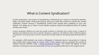 Content syndication is the process of redistributing existing content on third-party platforms to reach a broader audience, particularly in B2B marketing, where it helps to expand reach, improve SEO, and generate quality leads. Marketers should consider various factors when choosing platforms, including target audience, content type, analytics, cost, and platform credibility. Successful content syndication maximizes existing content's value and enhances brand visibility and authority in specific industries.