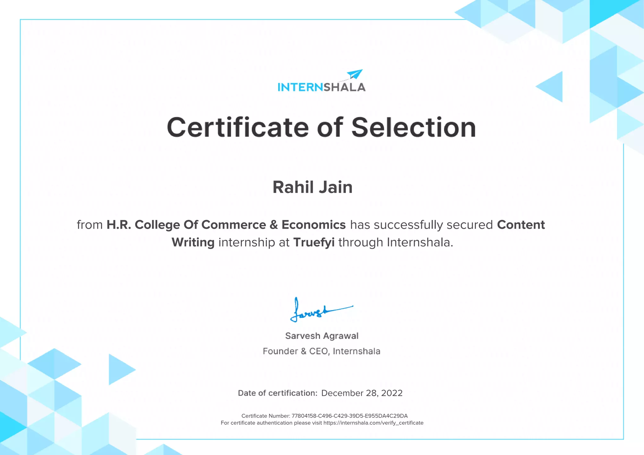 Rahil Jain secured a content writing internship at Truefyi through Internshala from H.R. College Of Commerce & Economics. The certificate number for Rahil Jain's internship is 77804158-C496-C429-39D5-E955DA4C29DA and can be authenticated by visiting https://internshala.com/verify_certificate.
