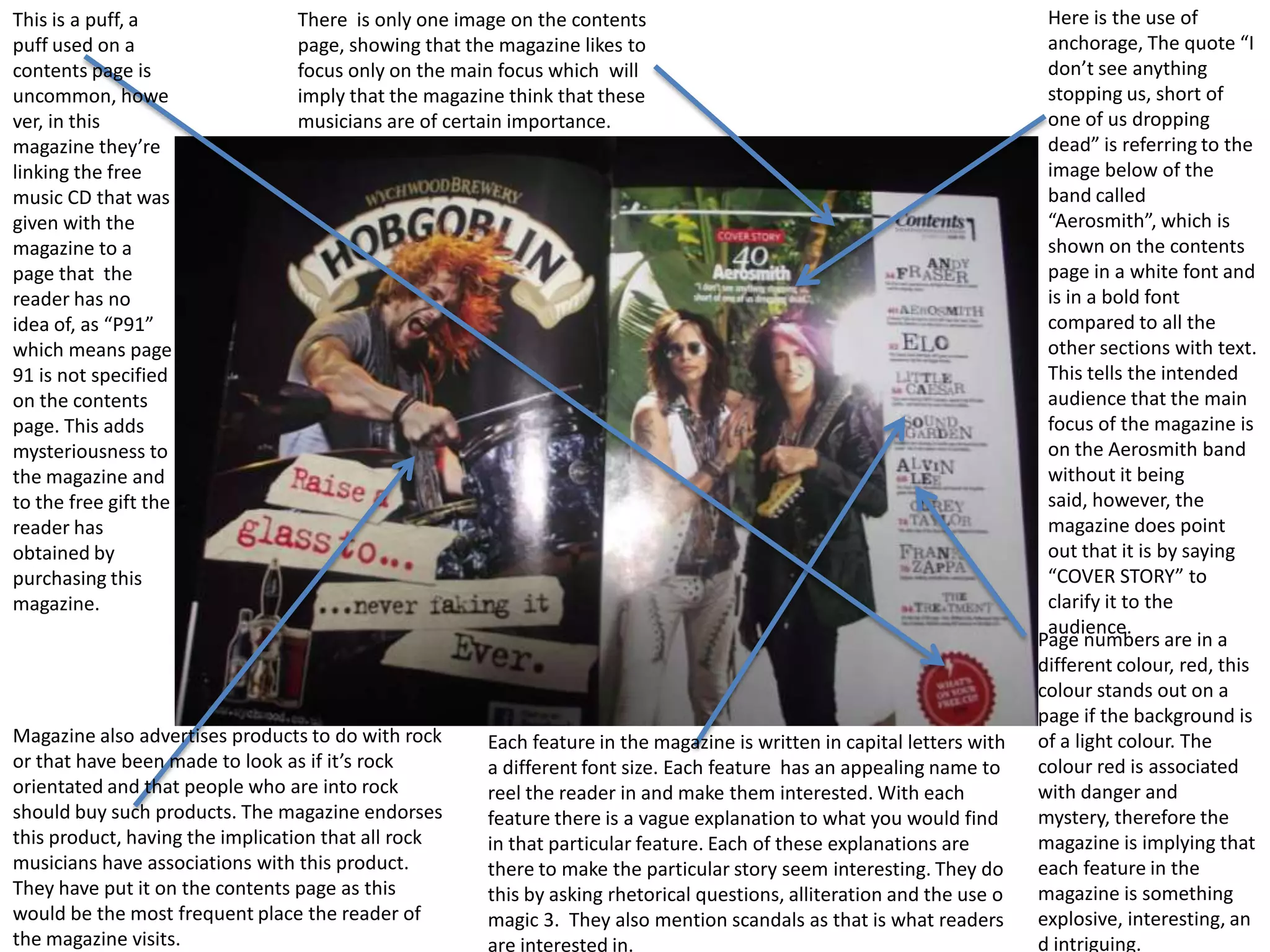 This contents page focuses on one main image of the band Aerosmith, implying their importance. It references a free music CD on page 91, adding mystery. The band name is in bold, identifying them as the cover story without saying so. Page numbers are in red, standing out and implying each feature is interesting or intriguing.