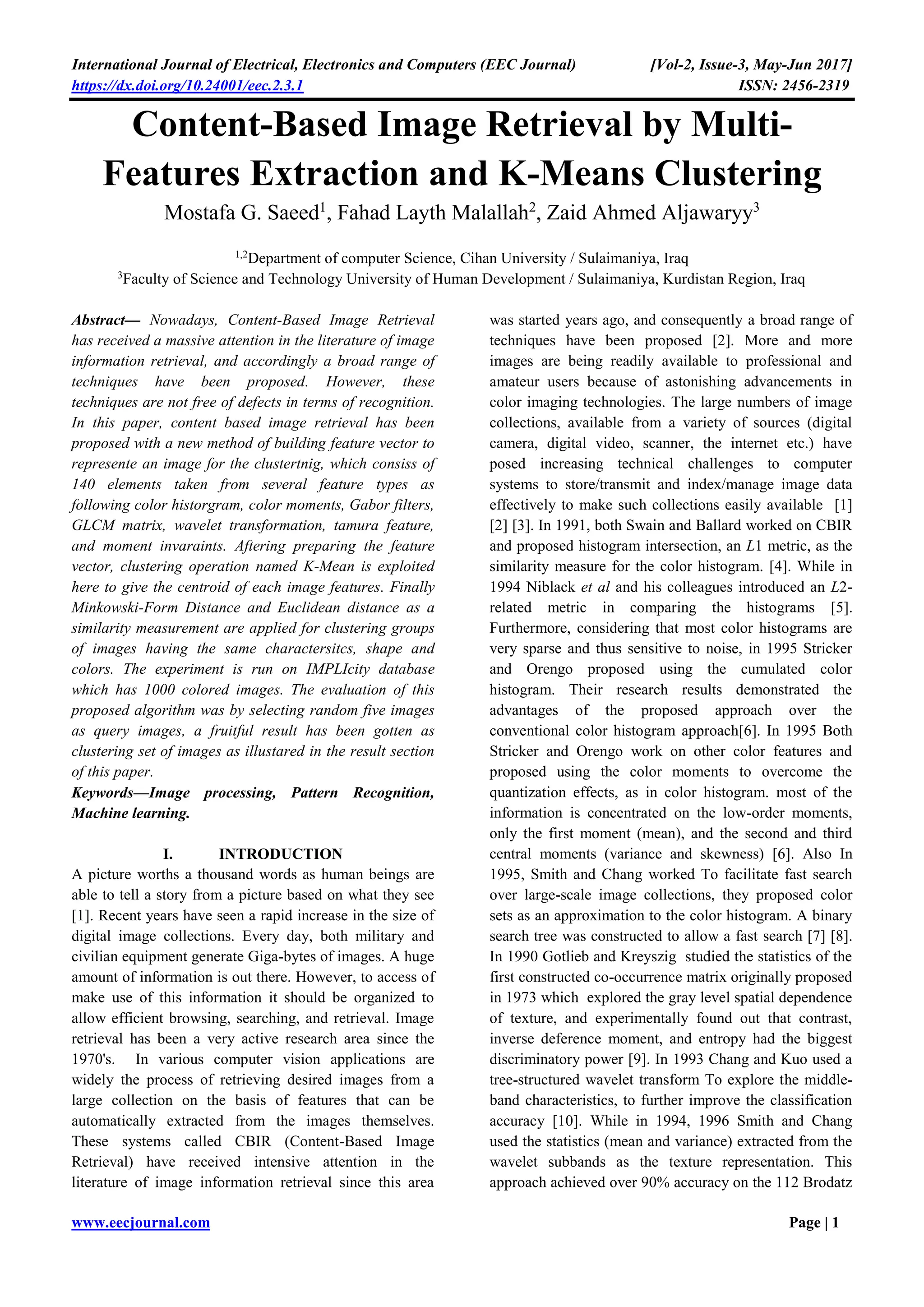 This document discusses a method for content-based image retrieval using multi-feature extraction and k-means clustering. The proposed method combines 140 elements from various features such as color histograms, texture characteristics, and wavelet transformations to build a robust feature vector for image classification. The effectiveness of the method is demonstrated through experiments on a database of 1,000 colored images, yielding successful clustering results.