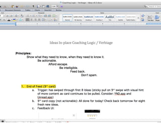 The document discusses key design principles from the video game industry, emphasizing the importance of prioritizing storytelling and designing for user discovery. It highlights the benefits of content-first design, such as reduced risk and cost, enhanced collaboration, and increased user engagement. The strategies include crafting a narrative that feels conversational and providing relevant content at moments when users have questions.