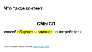 Документ обсуждает основы контент-маркетинга и его влияние на потребителей, подчеркивая важность качественного контента для SEO и привлечения пользователей. Приведены примеры успешных сайтов и рекомендации по созданию контента, включая текст, видео и графику. Также упоминаются ресурсы для обучения и улучшения навыков в этой области.