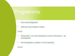 Over kennisobjecten Zelfeen kennisobject maken lunch Uitwisselen van kennisobjecten binnen Interactum: ‘de marktplaats’ Kennisobjecten inzetten in het onderwijs borrel Programma