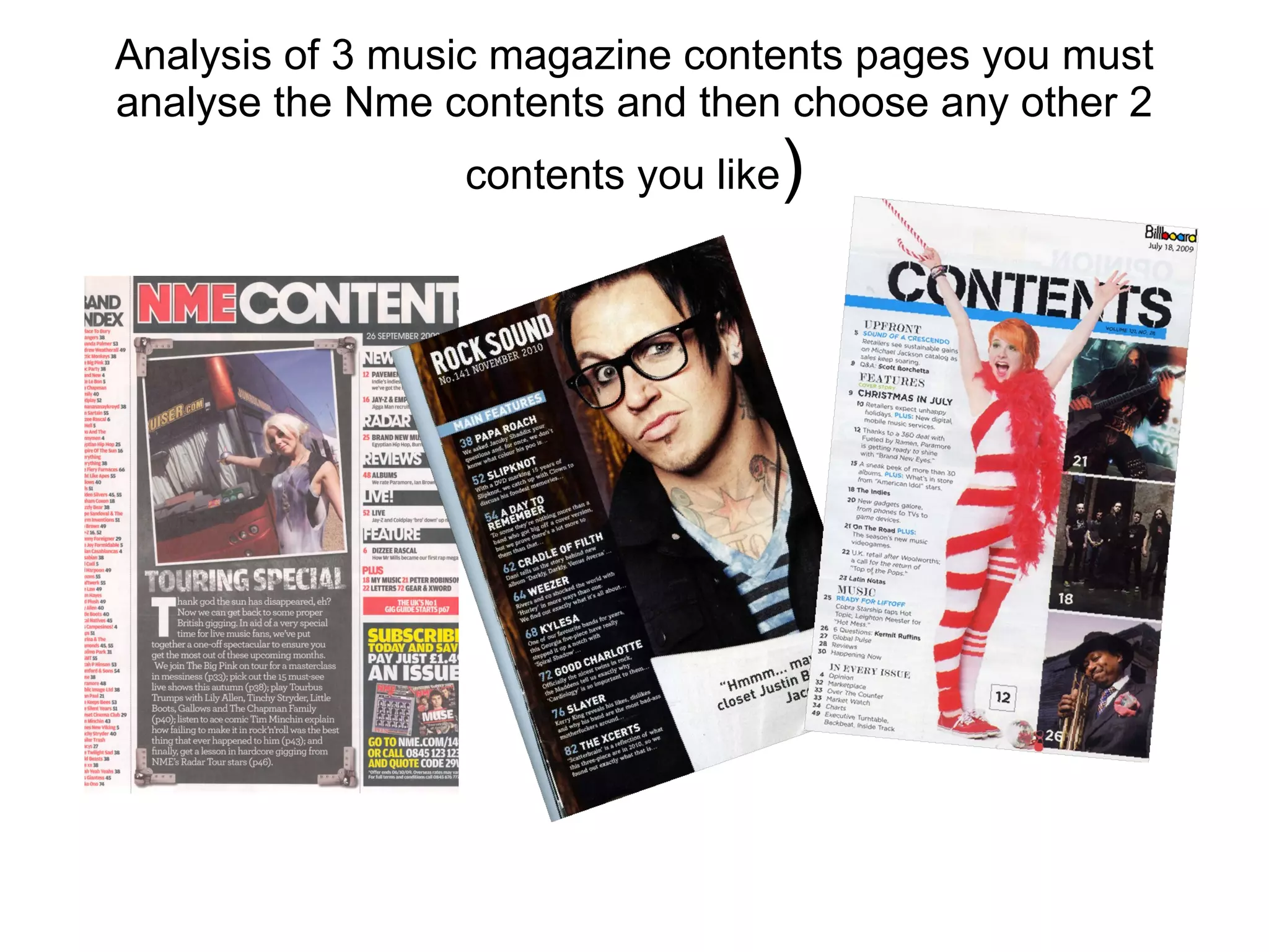 The document analyzes the contents pages of three music magazines: NME, Rock Sound, and Billboard. It discusses design elements like mastheads, images, headings, and summaries. Common across magazines are prominent images, mastheads matching the magazine title/branding, date and issue information, subheadings categorizing articles, and brief summaries allowing readers to find articles of interest. Rock Sound stands out by having a large lead image related to a quote about an unexpected artist preference. Billboard has smaller images and summaries under compact subheadings.