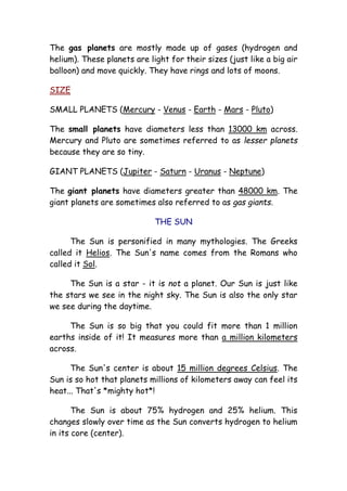 The document provides an overview of the solar system, including descriptions of the Sun, eight planets (Mercury, Venus, Earth, Mars, Jupiter, Saturn, Uranus, Neptune), Pluto, and the asteroid belt. It discusses the composition and features of each celestial body, such as Mercury being the smallest planet with possible volcanic activity, Earth being the only known planet that supports life, and Jupiter being the largest planet composed primarily of gas. Spacecraft that have visited and studied these objects are also mentioned.