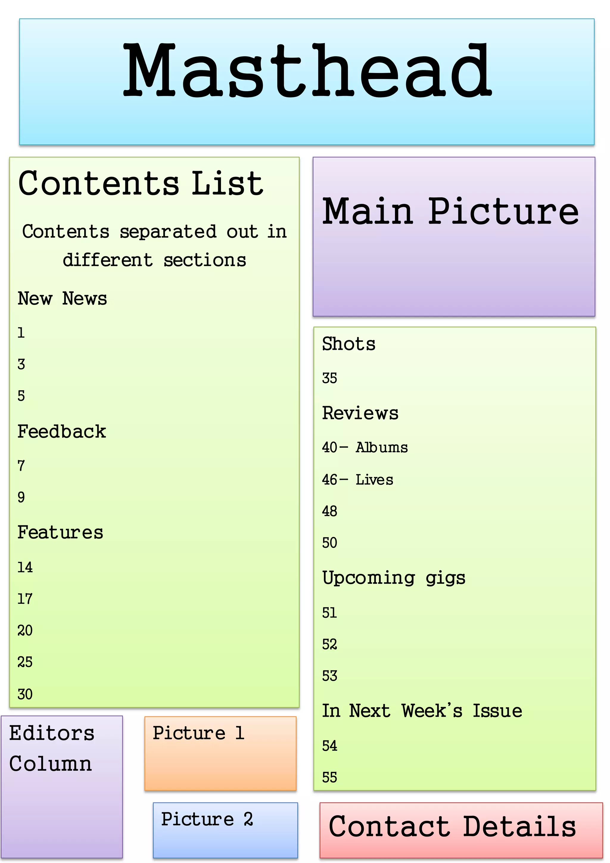 This document appears to be a magazine layout with various sections including main contents, news, feedback, features, reviews of albums and live performances, upcoming gigs, and information on the next issue. The layout includes page numbers for each section and images. Contact details are provided at the end.
