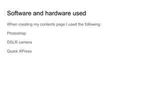 This document discusses the skills developed in creating a contents page. It outlines the software and hardware used which includes Photoshop, a DSLR camera, and Quark XPress. The skills learned are how to use a DSLR camera and understand settings like autofocus, how to edit images in Photoshop by cropping and adjusting saturation/vibrance, and how to properly format text for a professional magazine page.