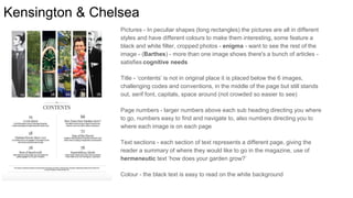 The document analyzes the codes and conventions used across contents pages in different regional magazines. It describes common visual elements like various styles and sizes of images placed throughout the pages. It also discusses textual conventions such as using columns of text labeled with subheadings to list article summaries. Page numbers are routinely presented next to text descriptions and images to guide readers to referenced articles. Overall formats are designed to efficiently yet engagingly inform readers of each magazine's contents.