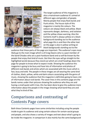 The target audience of this magazine contents page is fans of rock and punk music. The house style uses black and yellow colors, with contents in yellow on black to stand out. The main image is of Craig Owens, a member of the post-hardcore band Chiodos. Smaller images of other rock bands are included. Text uses yellow writing on black backgrounds to highlight important information. The page promotes an exciting variety of rock bands and artists through images and quotes associated with fast-paced, intense rock music.