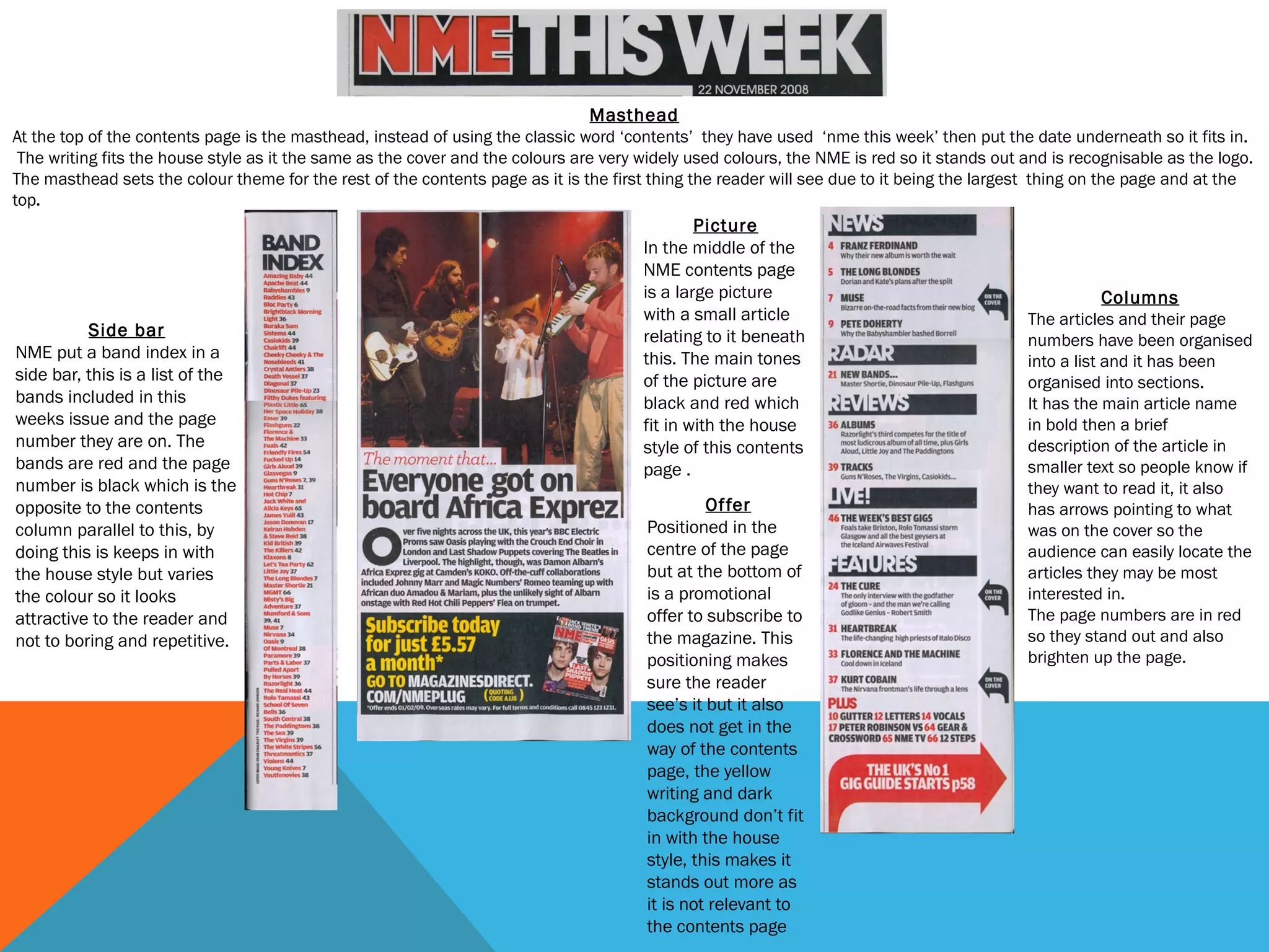 The contents page uses a distressed masthead font and bright colors to appeal to younger rock fans. Over half the page is taken up by a large photo of a band's lead singer, surrounded by smaller photos from inside articles. Columns are organized into sections with alternating red and black text, and a red star graphic behind page numbers relates to the magazine's heavy music genre. An editor's note gives a personal connection, and a black subscription offer contrasts the white background to stand out. Overall, the layout portrays a messy, scrapbook-style look fitting for its target teenage rock/metal audience.
