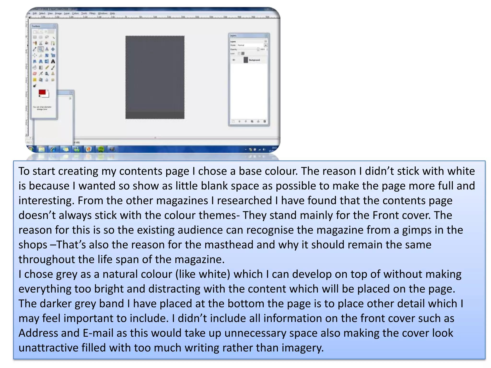 The document summarizes the process of designing a contents page for a magazine. It describes choosing a gray background color to avoid blank space and make the page more visually interesting. An image of a musician was selected from a photo shoot and adjusted to blend into the background without being distracting. Text elements like the title and section information were positioned according to the design plan. The title logo was modified to stand out better against the background images and colors.