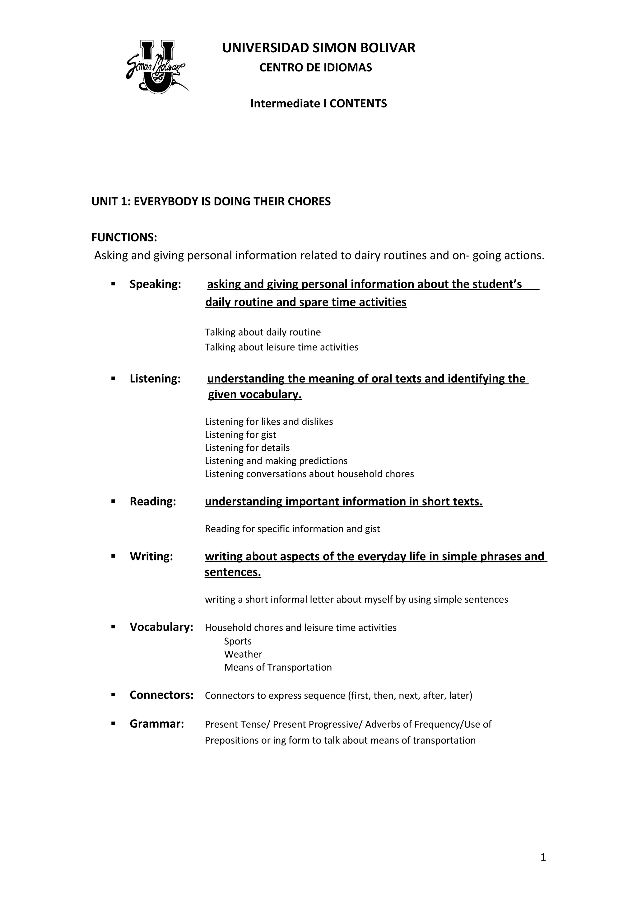 The document outlines the contents and structure of an intermediate English course divided into 4 units. Each unit focuses on different language functions and covers speaking, listening, reading, writing, vocabulary, grammar and connectors. Unit 1 focuses on daily routines and activities. Unit 2 is about ordering food and discussing preferences. Unit 3 addresses future plans and ambitions. Unit 4 gives descriptions of past events and experiences. The document provides an overview of the topics, skills and language covered in each unit to help students understand the course.
