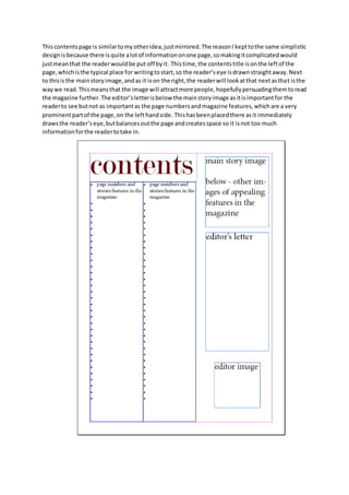 This page layout keeps the design simple with large text and images to avoid overwhelming the reader with too much information. The contents title is on the left to draw the eye, and the main story image is on the right as that is the typical direction of reading. This placement of text and images is intended to guide the reader's eye across the page and encourage them to read further into the magazine.