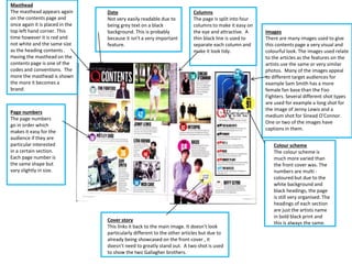 The document summarizes the key design elements of a magazine contents page. It describes how the masthead appears in red in the top left corner to brand the publication. The page is split into four columns with a thin black line separating each column to make the layout tidy and easy to read. Images are used throughout that relate to the articles and appeal to different audiences, using a variety of shot types. The color scheme is more varied than the front cover but remains organized with a white background and black headings.
