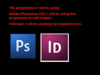 The document discusses the layout and design of a magazine contents page. It will include the issue number, date, a list of feature headings and descriptions, and a main image. The creator has chosen a black background and Gill Sans font for consistency. They have added colors, glows, and positioning to draw attention to key elements and fit all content. The main image is of the star featured on the cover, edited in Photoshop to remove the background and blend into the page.