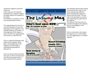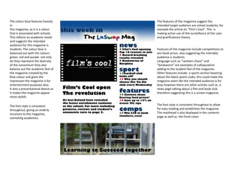 This magazine targets students as its intended audience. Features that suggest this include the masthead displaying the schools it represents, a cartoon-like front cover image of a girl with a film reel in the background supporting an article on a new film club. The use of student-relevant topics, competitions, and colloquial language further indicates the target is students. Color choices and consistent fonts create an orderly, academic feel while also making the magazine appealing and entertaining for its young audience.