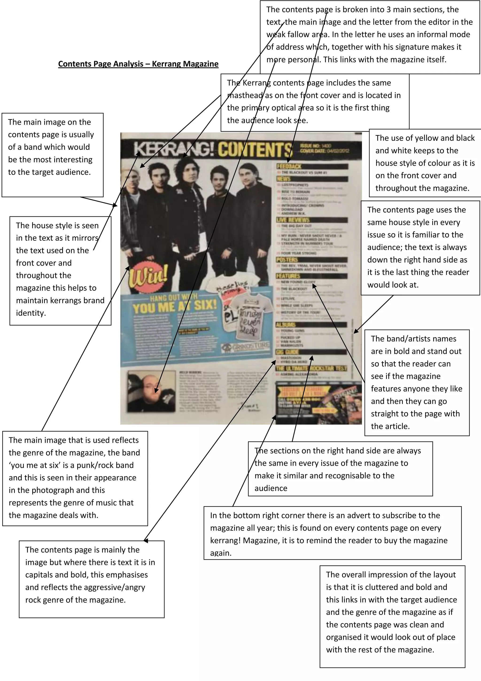 The document analyzes and compares the contents pages of two music magazines - Kerrang! and Q Magazine. Both magazines use their mastheads, continuous color schemes, and teasers to attract readers. However, Kerrang!'s contents page has a more cluttered layout while Q's is neatly structured. Kerrang! also uses a informal sans serif font compared to Q's more formal serif font. The main images on both pages reflect the magazines' genres by featuring popular bands, though Kerrang!'s image has a punk/rock style and Q's portrays its more sophisticated audience.