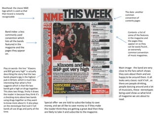 3) Common design elements like color schemes and images of musicians that match the magazine's target audience are also analyzed.