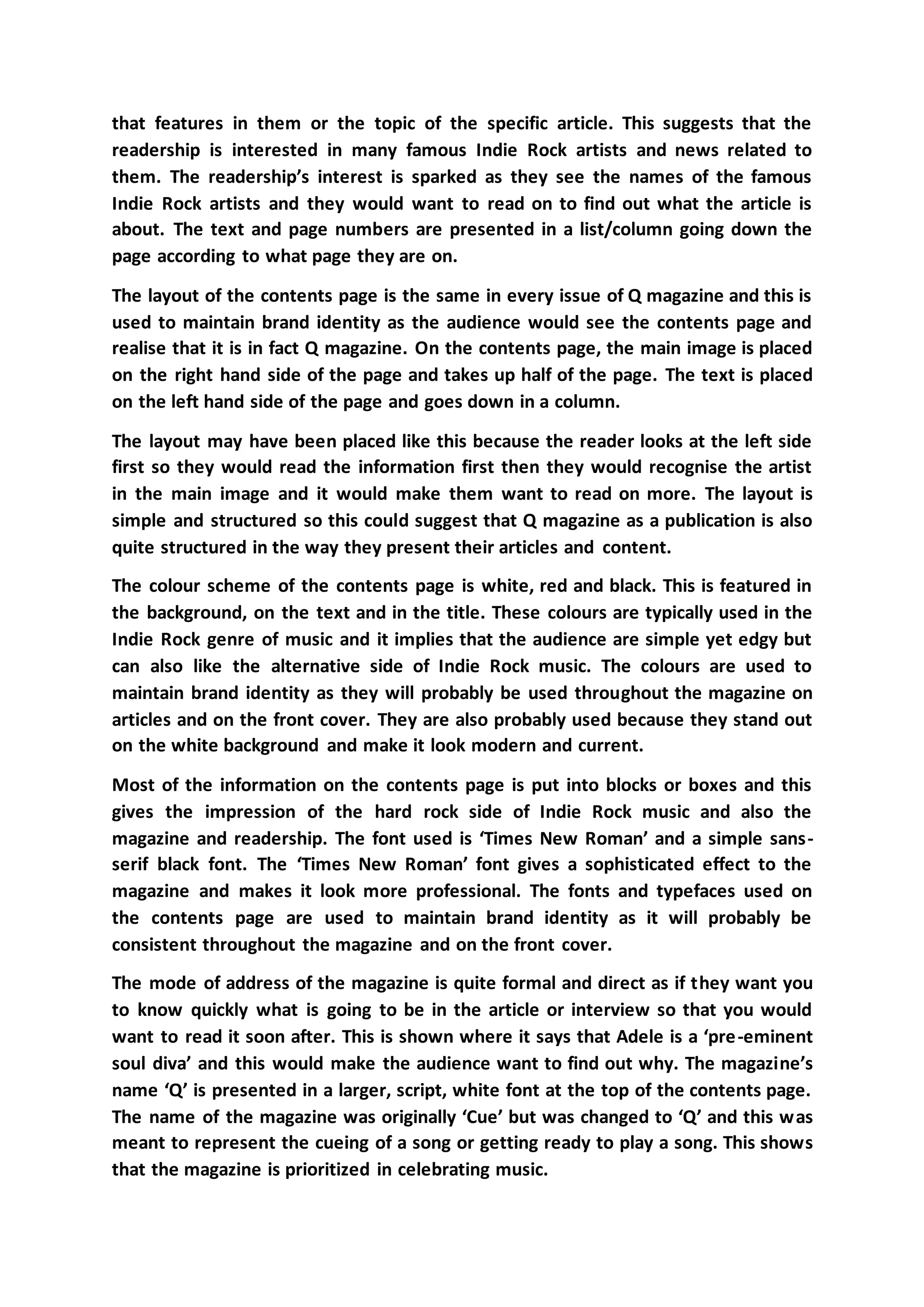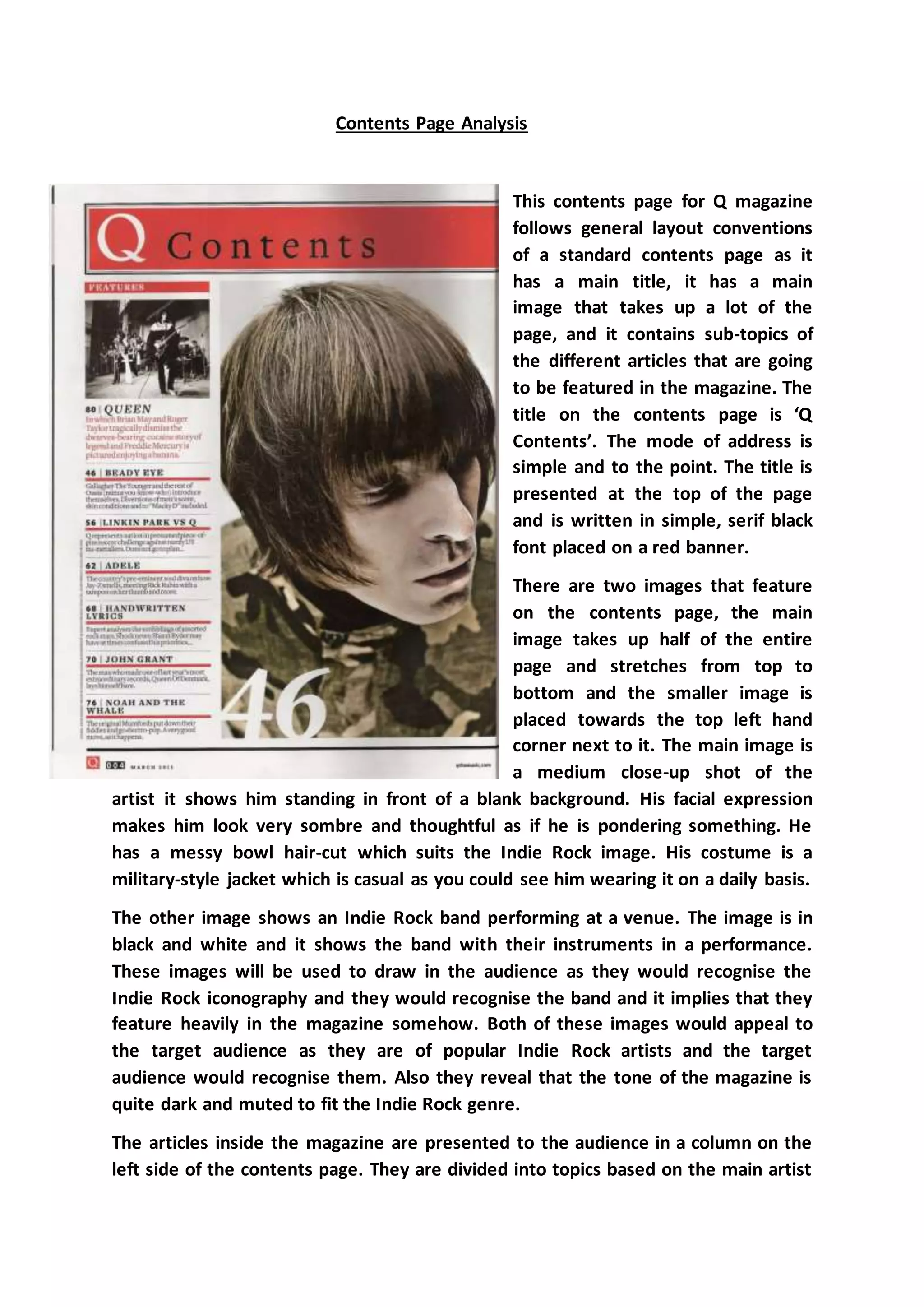 The document analyzes the contents page of Q magazine. It follows conventions with a main title in large font at the top, a large central image taking up half the page of a famous indie rock artist, and columns listing article topics and page numbers. The images are of popular indie rock artists meant to appeal to the target audience. The articles are divided by topic or featured artist. The layout, colors, fonts, and tone are consistent with the indie rock genre and help maintain the magazine's brand identity.