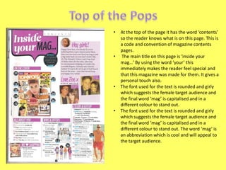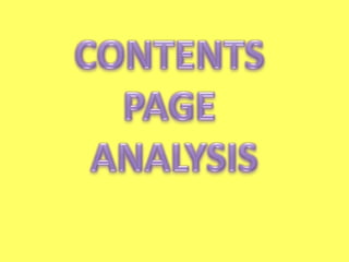 This contents page uses graphic design elements like bold fonts, column layouts, and colored headers and images to clearly organize information and guide the reader's eyes to important details. The main image draws immediate attention and the caption below promotes the related article. Sections are categorized by colored headers and provide article snippets to help readers find topics of interest. Additional features like a band index and subscription advertisement further engage the target audience. Overall the page utilizes visual cues and organization to efficiently showcase content for readers.