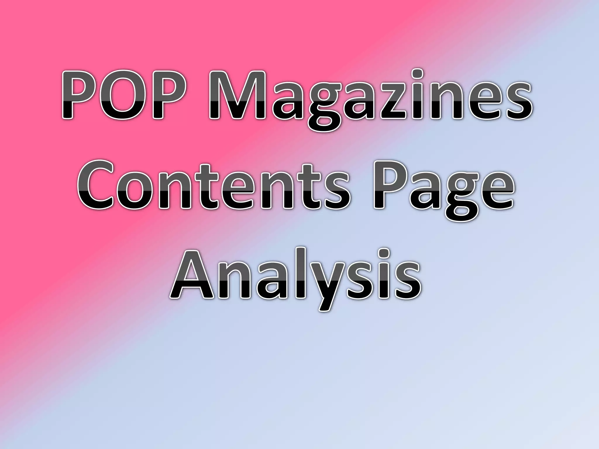 The document analyzes the contents page of a pop music magazine aimed at young girls. It discusses the layout, images, colors, and text used to attract and engage readers. Key features summarized include the use of bright colors and photos of popular artists to draw in readers, short subheadings and lists to make navigation simple, and inclusion of posters and non-music content to appeal to readers' interests in celebrities and fashion. The contents page uses a conversational tone and focuses on topics likely to appeal to its target audience of teenage girls.